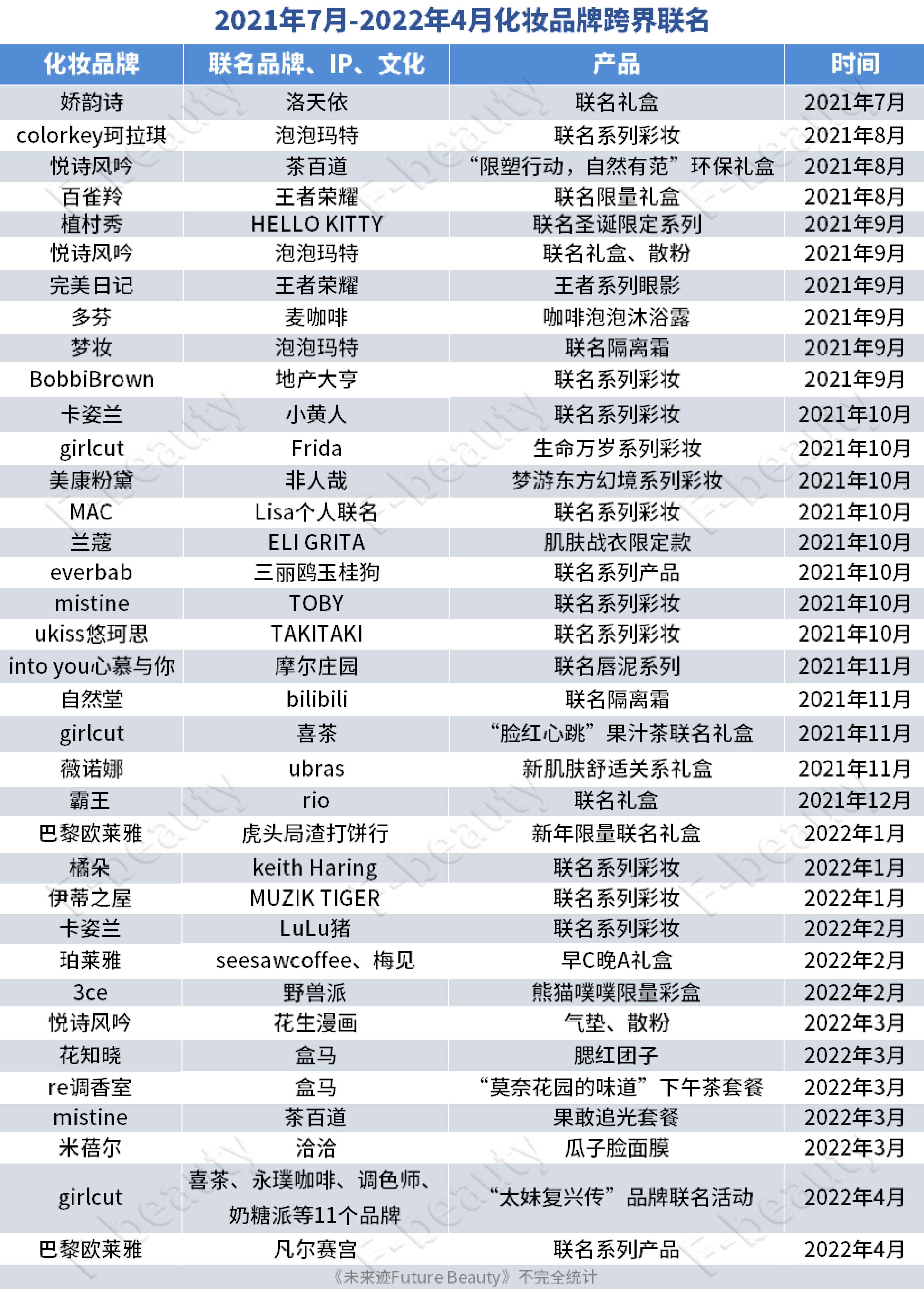 《未来迹Future Beauty》整理2021年下半年至2022年第一季度9个月里各美妆品牌联名发现,主要集中在文化艺术、潮玩、餐饮三个方面。