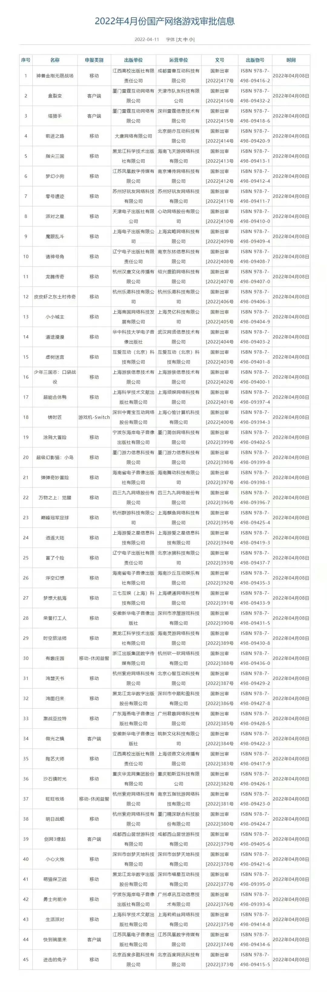 2022年4月,国产网络游戏审批信息发布,《沙石镇时光》《铸时匠》《剑网3缘起》《盒裂变》《派对之星》等 45 款游戏过审。消息一出,游戏板块整体飘红,多只游戏个股出现不同程度涨幅。