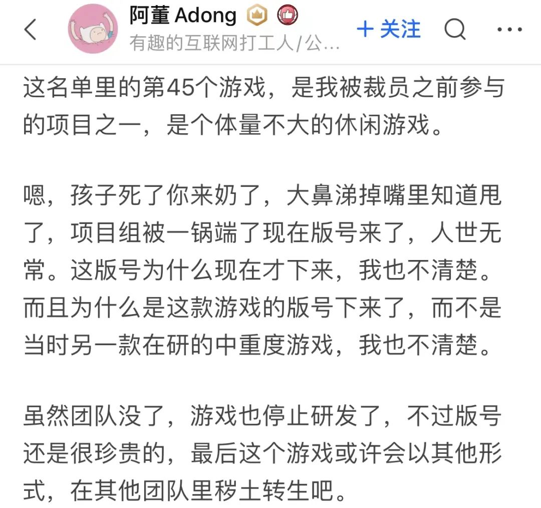 曾参与该项目的阿董Adong在知乎透露:“是我被裁员之前参与的项目之一。虽然团队没了,游戏也停止研发了,不过版号还是很珍贵的,最后这个游戏或许会以其他形式,在其他团队里秽土转生吧。”可见《进击的兔子》虽然拿到了版号,但能否以“原样”问世还是未知。