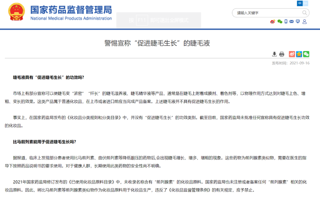 该科普文还指出,虽然使用比马前列素、曲伏前列素等降低眼压的药物后,会出现睫毛增长、增多、增粗的现象,但这些药物并未收录于现行《已使用化妆品原料目录》中,且国家药监局也并未注册或者备案任何“前列腺素”相关的化妆品新原料。因此,将比马前列素等前列腺素类似物作为化妆品原料用于化妆品生产,违反了《化妆品监督管理条例》的有关规定,应予禁止。