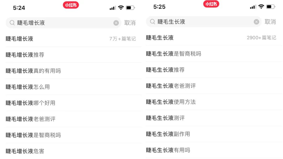 目前在小红书上,“睫毛增长液”相关笔记数高达7万+篇,“睫毛生长液”相关笔记则有近3000篇;抖音、快手、B站等平台上,推荐睫毛生长液的“种草”美妆视频多达上万个。