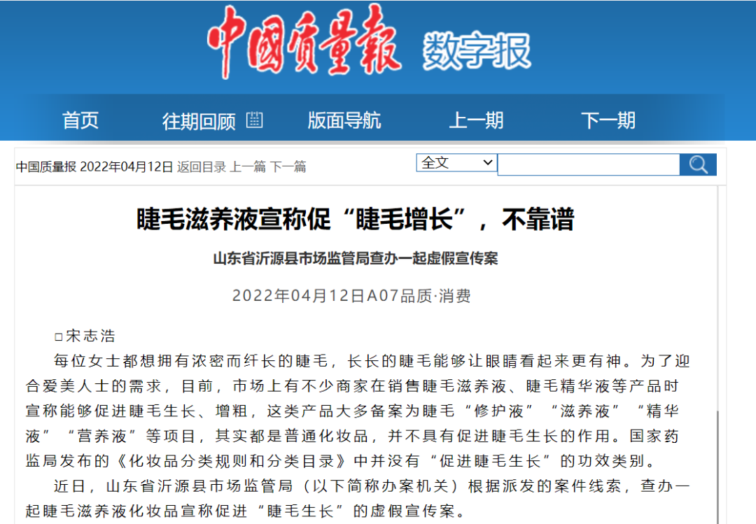 事实上,这并不是监管层首次对“宣称促进睫毛生长功效”的化妆品进行整顿。