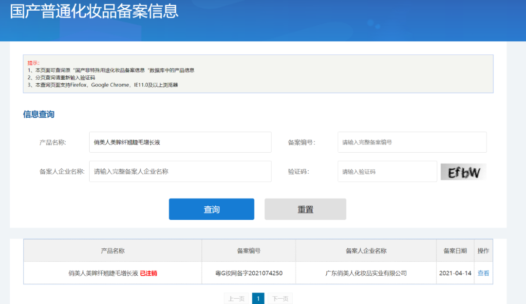 需要注意的是,化妆品观察查询发现,目前国家药监局官网注册备案平台上,不少睫毛增长液产品的状态显示为“已注销” 。如,一款备案日期显示为去年4月14日的“俏美人美眸纤翘睫毛增长液”,目前已处于“已注销”状态。