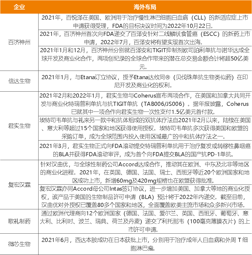 2022年年初,信达生物PD-1产品信迪利单抗在美国的上市申请遭FDA驳回,“出海”一时之间成为了国内医药行业深度讨论的话题之一。如今,国内商业化相对成熟的生物医药企业们已经不再满足于产品的国内获批,而是强调产品的海外获批以及与国际药企的商业合作。正如一些业内人士所讲,拳头产品的国际化也在印证国内biotech向biopharma的转化。