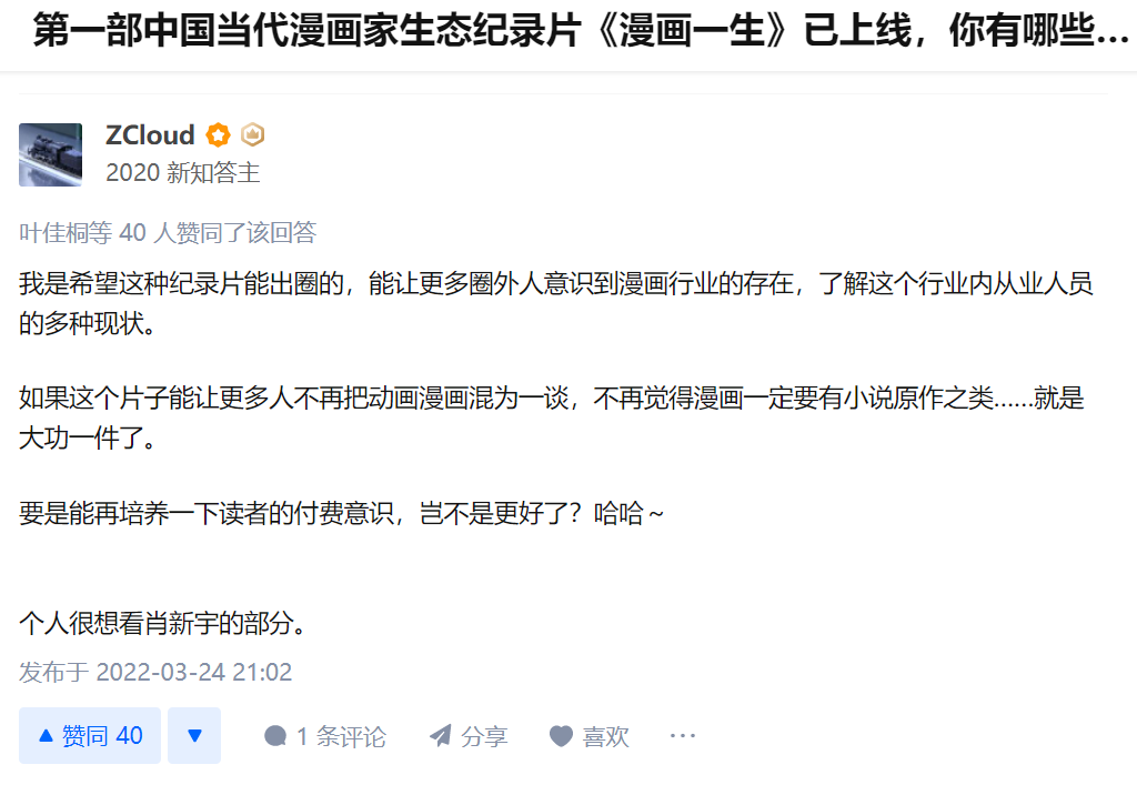 许多《漫画一生》观众观看后收获的感想是,漫画家“不容易”“辛苦”,甚至很“惨”。在社交平台评论中,有人还提出这样的疑问:纪录片里谈及了漫画家的创作困境,他们都在尽力坚持,但反观现实,为什么当下中国漫画市场作品质量还是参差不齐?