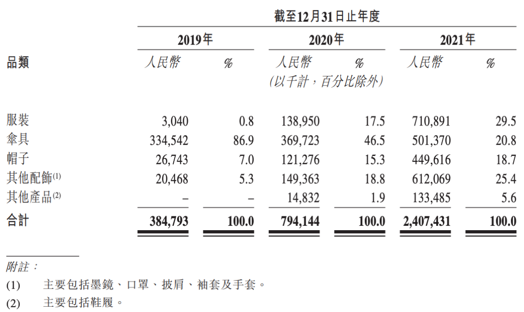 特别说明的是,蕉下2021年卖出的全部伞具合计才获得5.01亿元,还不及当期的推广费用。同期,蕉下来自服装、帽子和其他配饰的收入分别为7.11亿元、4.50亿元和6.12亿元,其中服装收入已经超越伞具,并遥遥领先于其它品类。