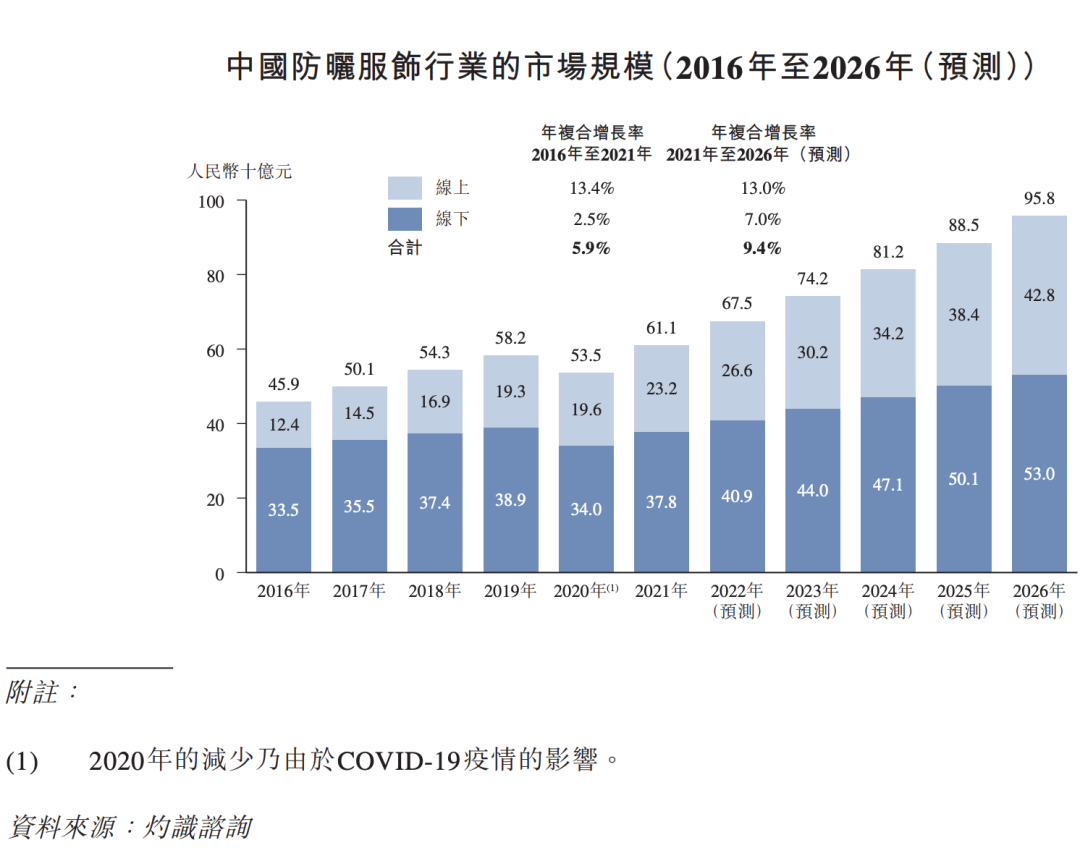 根据灼识咨询,防晒服饰的市场规模由2016年的人民币459亿元增至2021年的611亿元,年复合增长率为5.9%;自2021年至2026年,其预计将以9.4%的年复合增长率增长,2026年市场规模将达到958亿元。