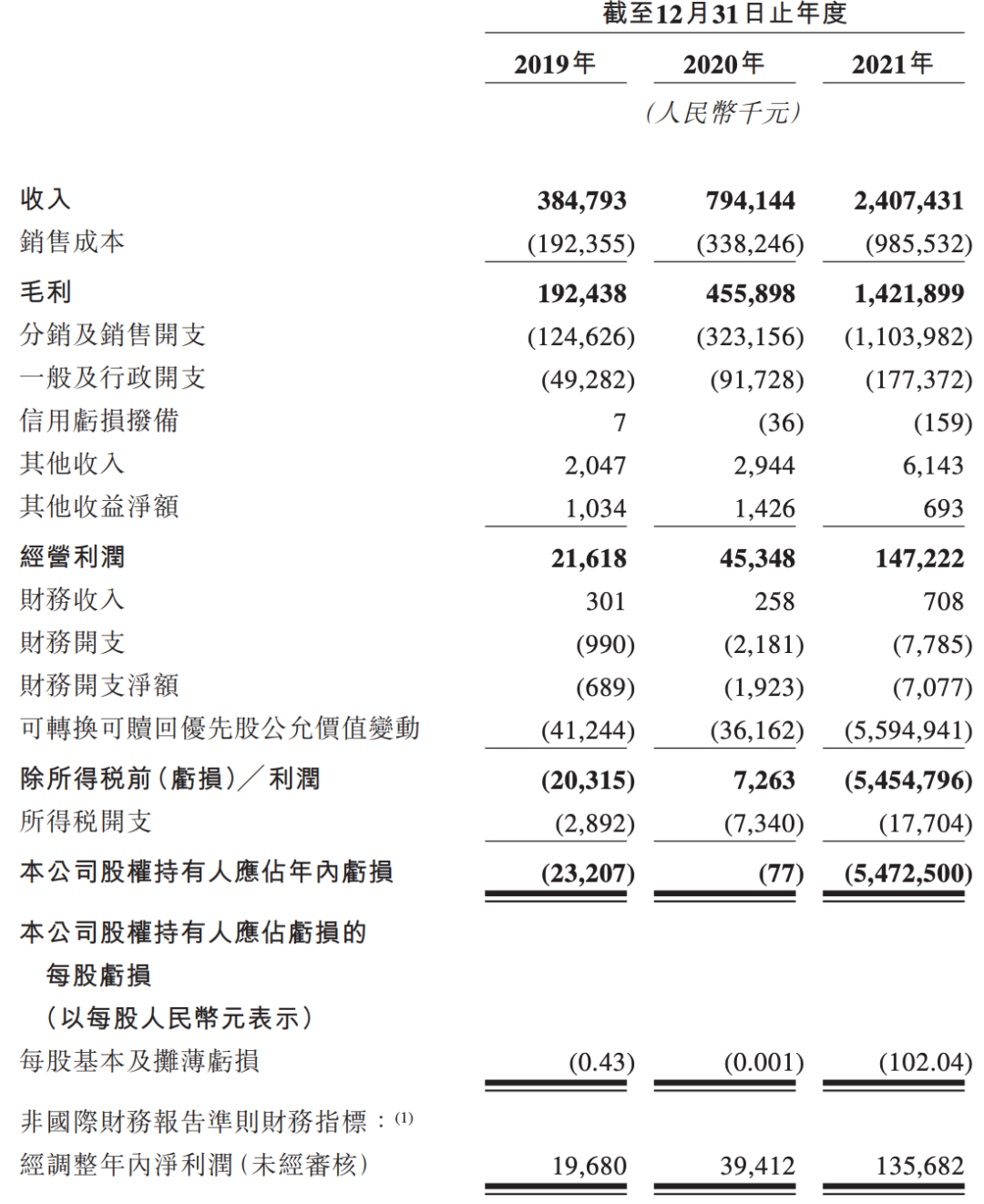 招股书显示,蕉下2019年、2020年和2021年的营收分别为3.85亿元、7.94亿元和24.07亿元;该公司股权持有人应占年内亏损(净亏损)分别为2320.7万元、7.7万元和54.73亿元,亏损规模飙升。