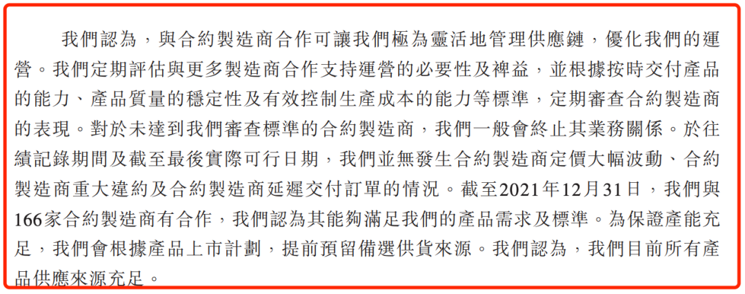 蕉下认为,与合约制造商合作可让该公司极为灵活地管理供应链,优化运营。截至2021年12月31日,蕉下与166家合约制造商有合作。蕉下方面称,前述合约制造商能够满足该公司的产品需求及标准。