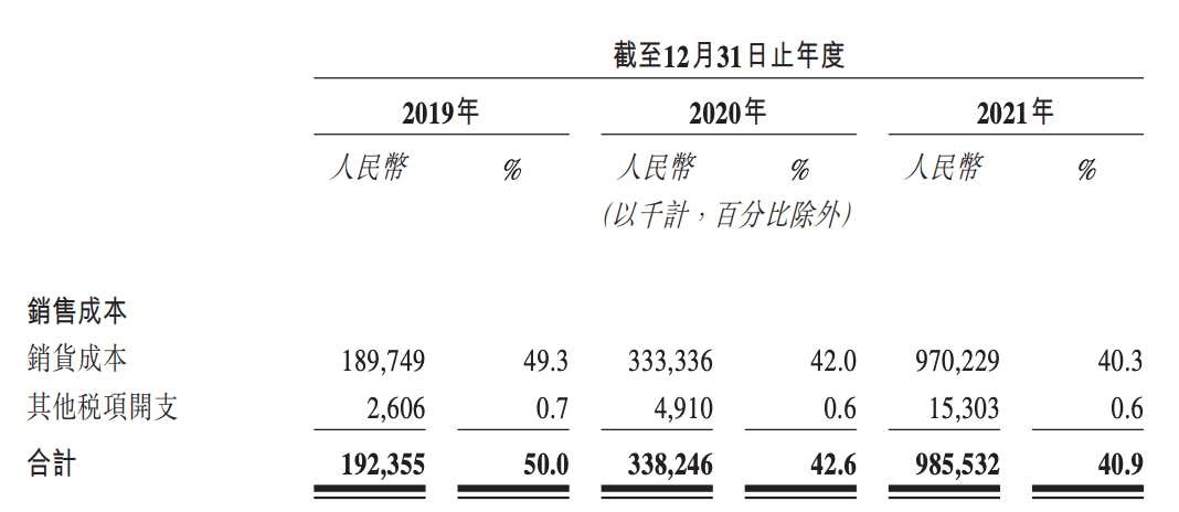 报告期内,蕉下的销售成本分别为1.92亿元、3.38亿元和9.86亿元,分别占其各期收入的50.0%、42.6%和40.9%。换句话说,蕉下全部收入中的四成到五成都要支付给其供应商,用来采购成品。