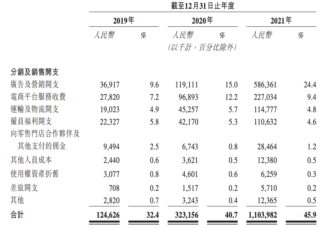 为了实现自身的运营,蕉下进而产生分销及销售开支、一般及行政开支和研发开支等。报告期内,蕉下的分销及销售开支分别为1.25亿元、3.23亿元和11.04亿元,占总收入的比例分别为32.4%、40.7%和45.9%。