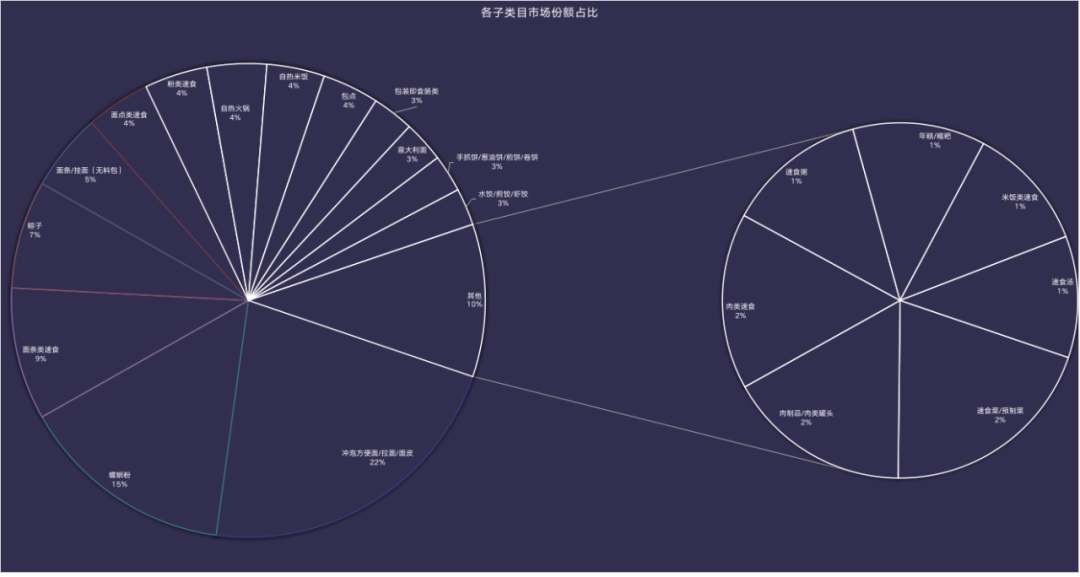 魔镜市场情报数据显示,从2021年4月到2022年3月的一年时间内,淘宝+天猫平台上的方便速食/速冻食品类目共完成销售额229.58亿,其中子类目销售额TOP10基本都是方便面、粉类速食、自热火锅、自热米饭等,冲泡方便面/拉面/面皮的市场份额最高,占比20.83%,销售额近48亿,但看速食菜/预制菜一类,销售额仅4.5亿,占比不到2%。