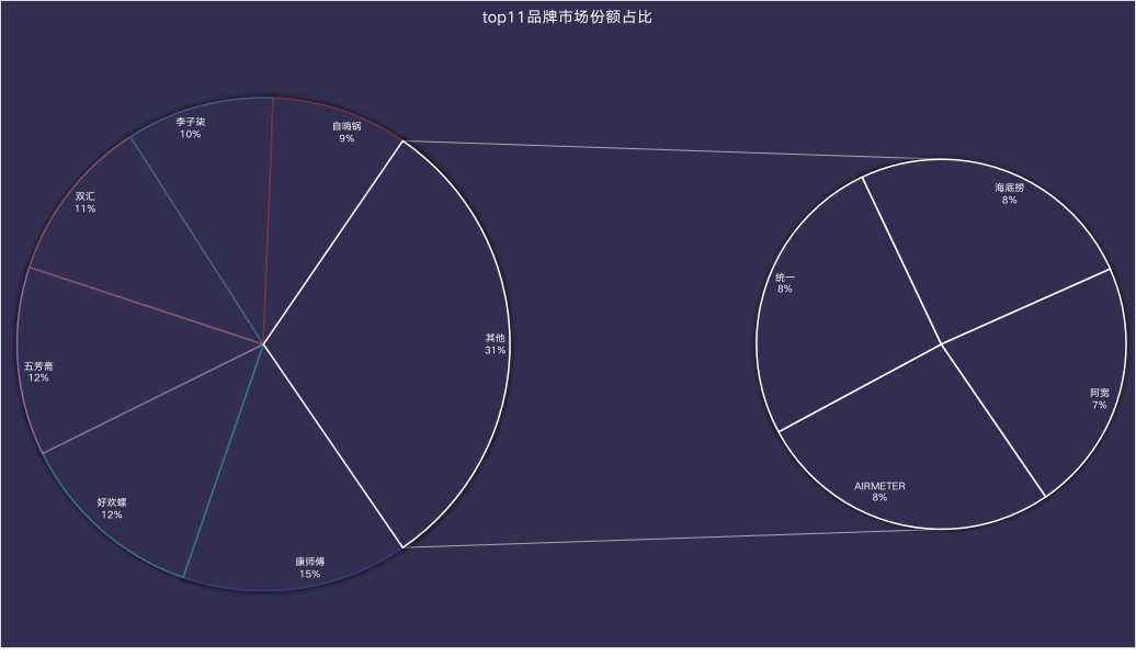 从品牌来看,TOP10品牌基本都为方便面、螺蛳粉、自热火锅、面皮等品类;五芳斋除粽子外还有冷冻面点或卤味类;AIRMETER空刻为意面速食类。TOP10-20甚至都没有出现预制菜,还是以面类速食、自热火锅、螺蛳粉、速冻丸子为主。