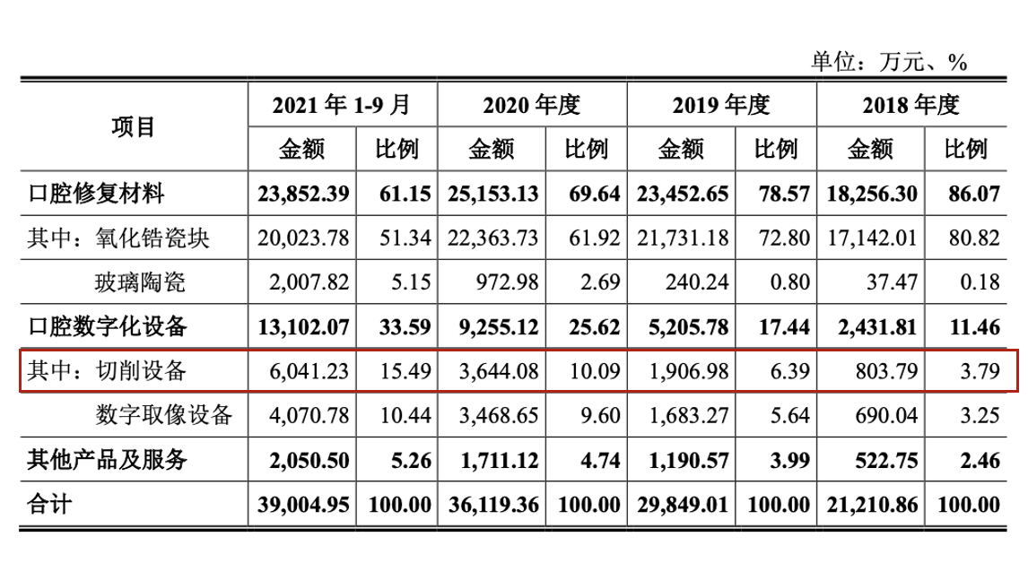 收入构成来看,爱迪特的口腔修复材料主要以氧化锆瓷块为主,但是报告期内(2018年-2021年前三季度)收入增幅并不大,公司增收主要在于口腔数字化设备的切削设备。