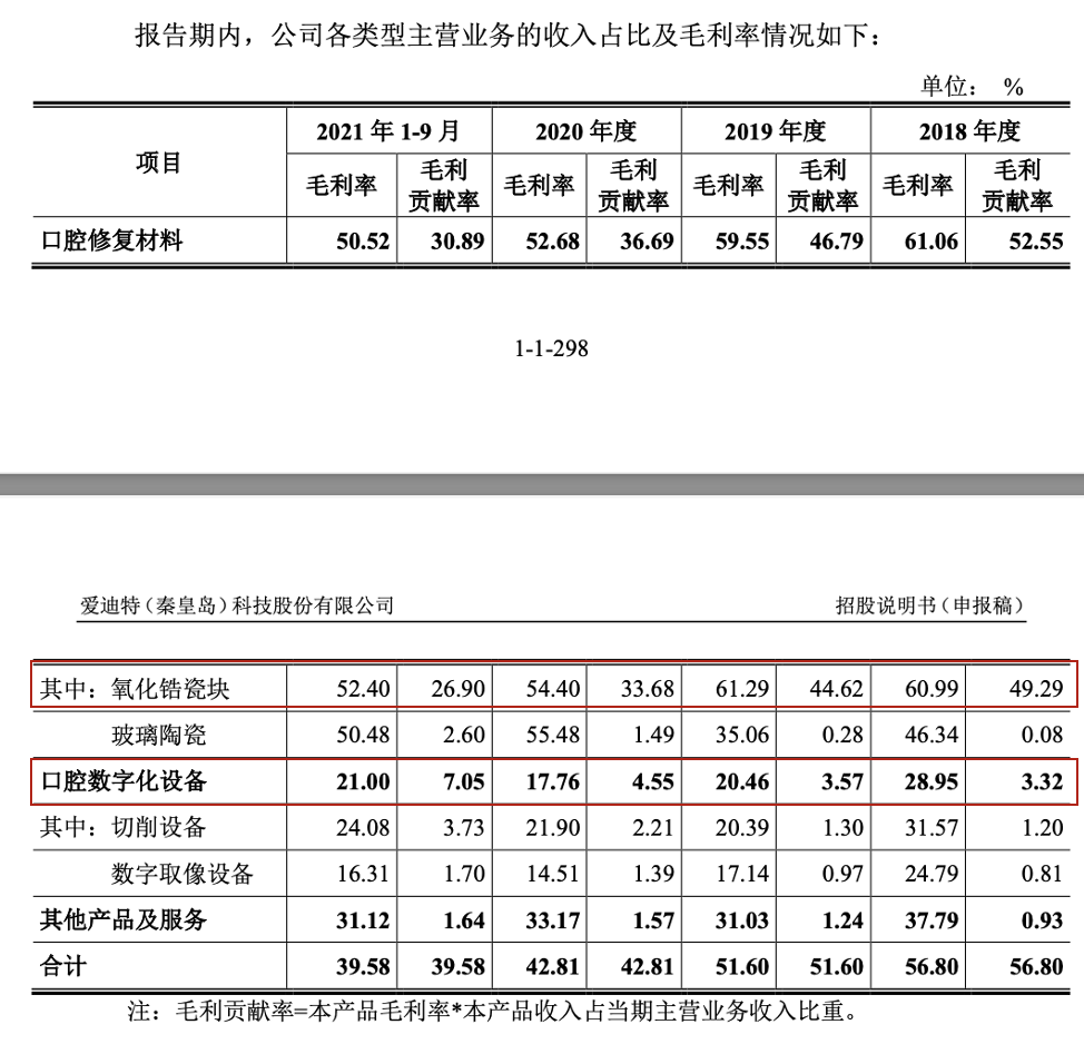 爱迪特毛利率下滑系两方面原因,一是口腔修复材料中的氧化锆瓷块毛利率降幅较大,其毛利率由2019年的60.99%下滑至2021年前三季度的54.40%,同期平均单价由354.15元/块下滑至296.22元/块。