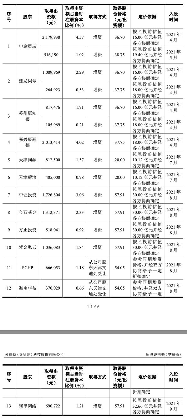 招股书显示,2021年爱迪特引进11家外部股东(天津同源、天津后浪为员工股权激励),其中不乏中金启辰、中证投资、金石基金,方正投资等明星资本,短短半年公司估值也翻了一番。