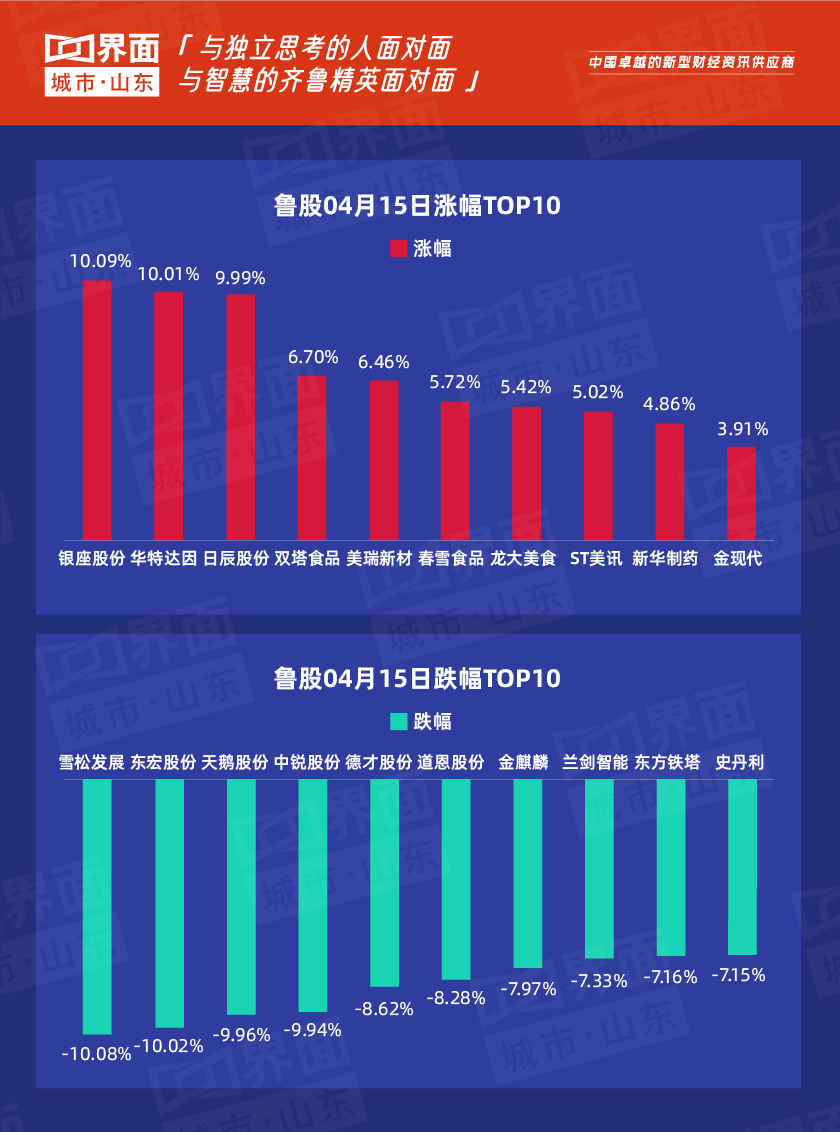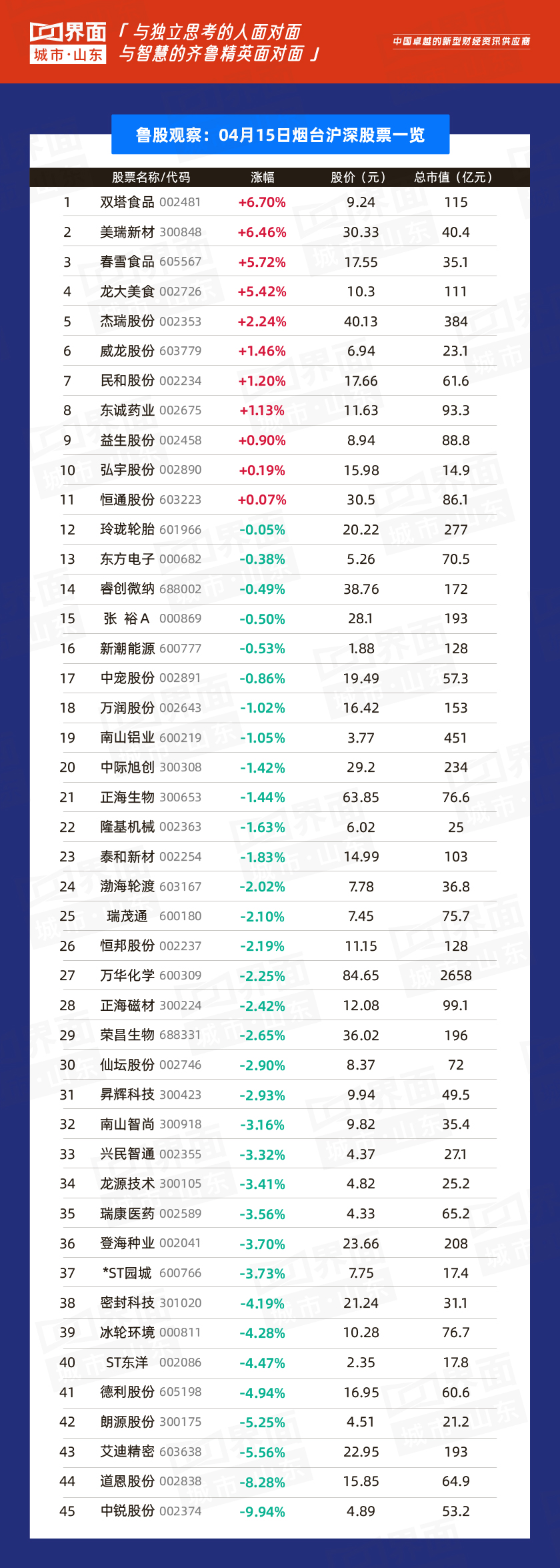 4月15日,山东省内沪深股票有57只个股上涨,208只个股下跌。