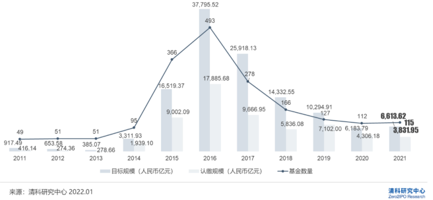 另一面,“基金招商”似乎成为了许多地方政府的共识,大到省会小到区县纷纷成立母基金,动辄百亿元人民币规模。清科研究中心数据显示,2021年新设立政府引导基金115支,同比上升2.7%,目标规模约6613.62亿人民币,同比上升7.0%;已认缴规模约3831.95亿人民币,同比下降11.0%。其中,百亿以上规模的引导基金设立数量有所增加。