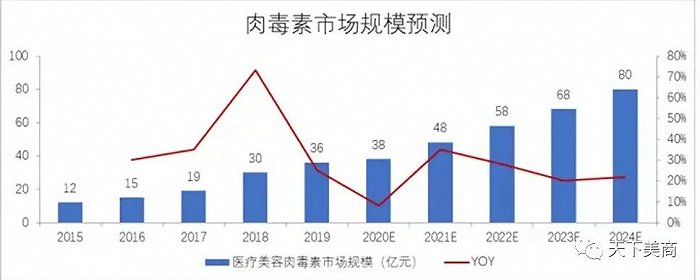 2019年国内肉毒素市场份额是6亿美元,渗透率约为2%,每年超过20%的速度在增长;对比海外市场渗透率,2025年国内的肉毒素市场份额可能达到18亿美元(约为117亿人民币)。