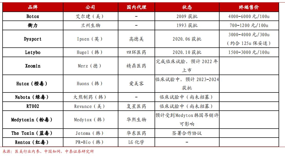 天下美商了解到,目前在研的肉毒素至少有5家,其中商业化进展最快的是德国Merz/精鼎医药的Xeomin,预计2022年上市;Xeomin海外售价与保妥适接近均为高端产品。此外,韩国的绿毒(Nabota)和爱美客的橙毒(Hutox)定位均较为低端,后者预计2023-2024年获批。