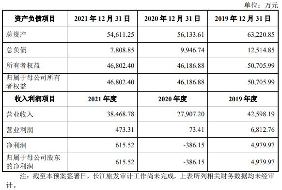 截至重组预案签署日,长江旅发资产剥离工作尚未完成,无法披露本次收购资产部分所对应的财务数据。长江旅发(分立前)最近三年的主要财务数据显示,2020年度营业收入和净利润遭受“重创”之后,2021年度的收入和净利润均仍未恢复至新冠肺炎疫情前的水平。2021年度营业收入3.85亿元,但营业利润仅0.05亿元,净利润为0.06亿元。