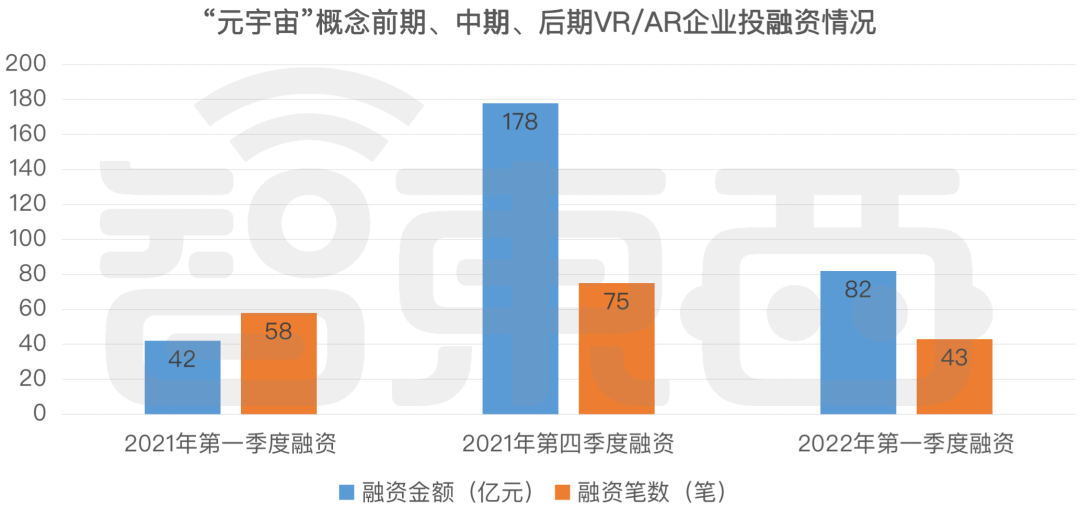 ▲2022年第一季度(“元宇宙”概念后期)与2021年第一季度(“元宇宙”概念前期)、2021年第四季度(“元宇宙”概念中期)VR/AR企业投融资情况