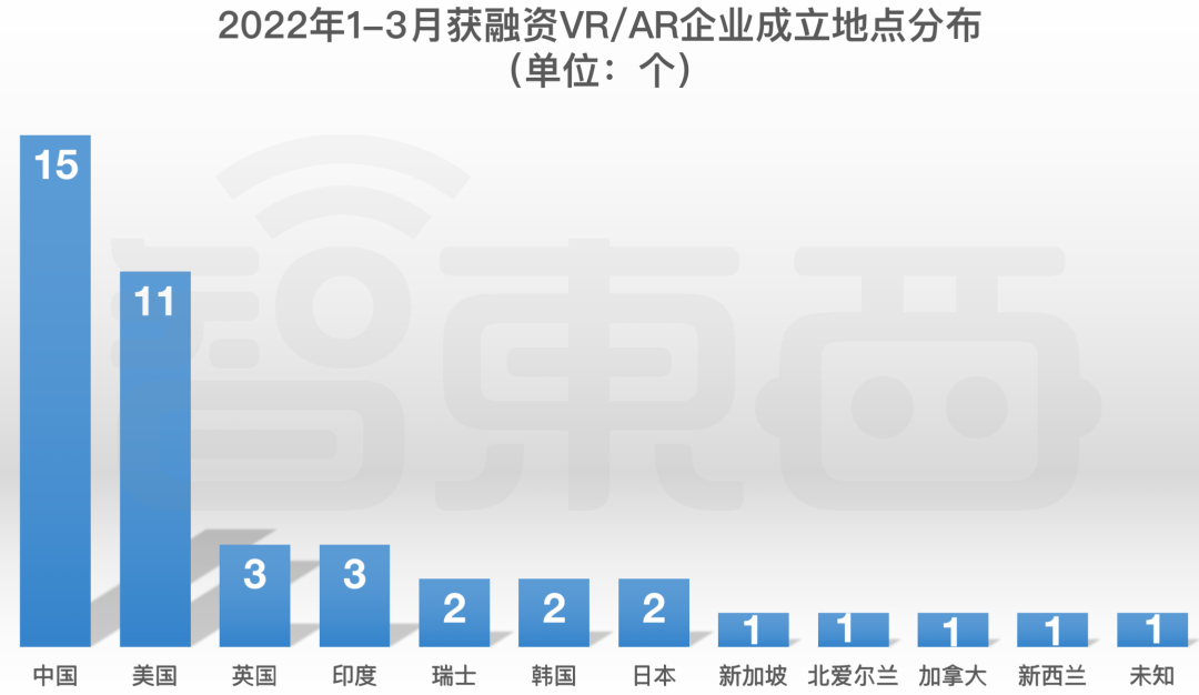 我们看到2022年第一季度获得融资的VR/AR行业主要汇聚在国内以及美国。国内VR/AR企业融资发生的最多,达到15笔,美国有11笔融资,其他国家如英国、日本、印度等VR/AR企业也会出现新的融资,但均维持在2、3家左右。