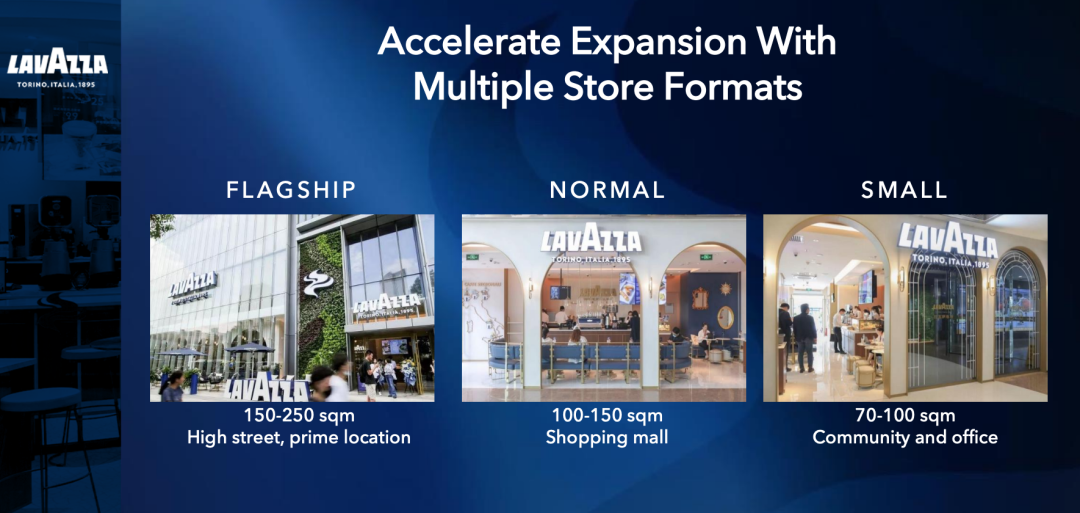 一般而言,Lavazza旗舰店占地面积为150-250平方米,选址位于高端繁华商圈,例如其亚洲官方首店开在了上海静安寺晶品购物中心,这也是Lavazza在意大利以外第一个咖啡旗舰店;标准店面积100-150平方米左右,开设在购物中心;而迷你店面积大约70-100平方米,位于社区和办公场所。