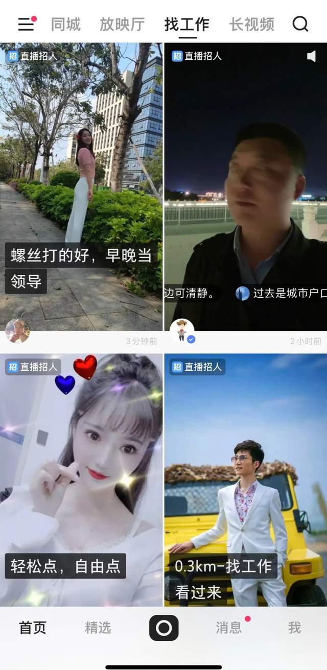 在4月初的8.0版本中,快手首页顶部栏由原来的“关注”“发现”“精选”“放映厅”变成“关注”“发现”“同城”“放映厅”“找工作”“长视频”——其中,“找工作”绝大多数都是面向蓝领用户的直播招聘需求,进一步凸显快手对蓝领招聘市场的渴望。