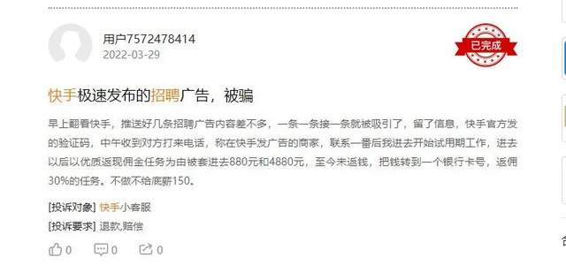 “早上翻看快手,推送好几条招聘广告内容差不多……中午收到对方打来电话,称在快手发广告的商家,联系一番后我进去开始试用期工作,进去以后以优质返现佣金任务为由被套进去880元和4880元……”3月29日,有用户就在“黑猫平台”称,因为快手极速发布的招聘广告而被骗。