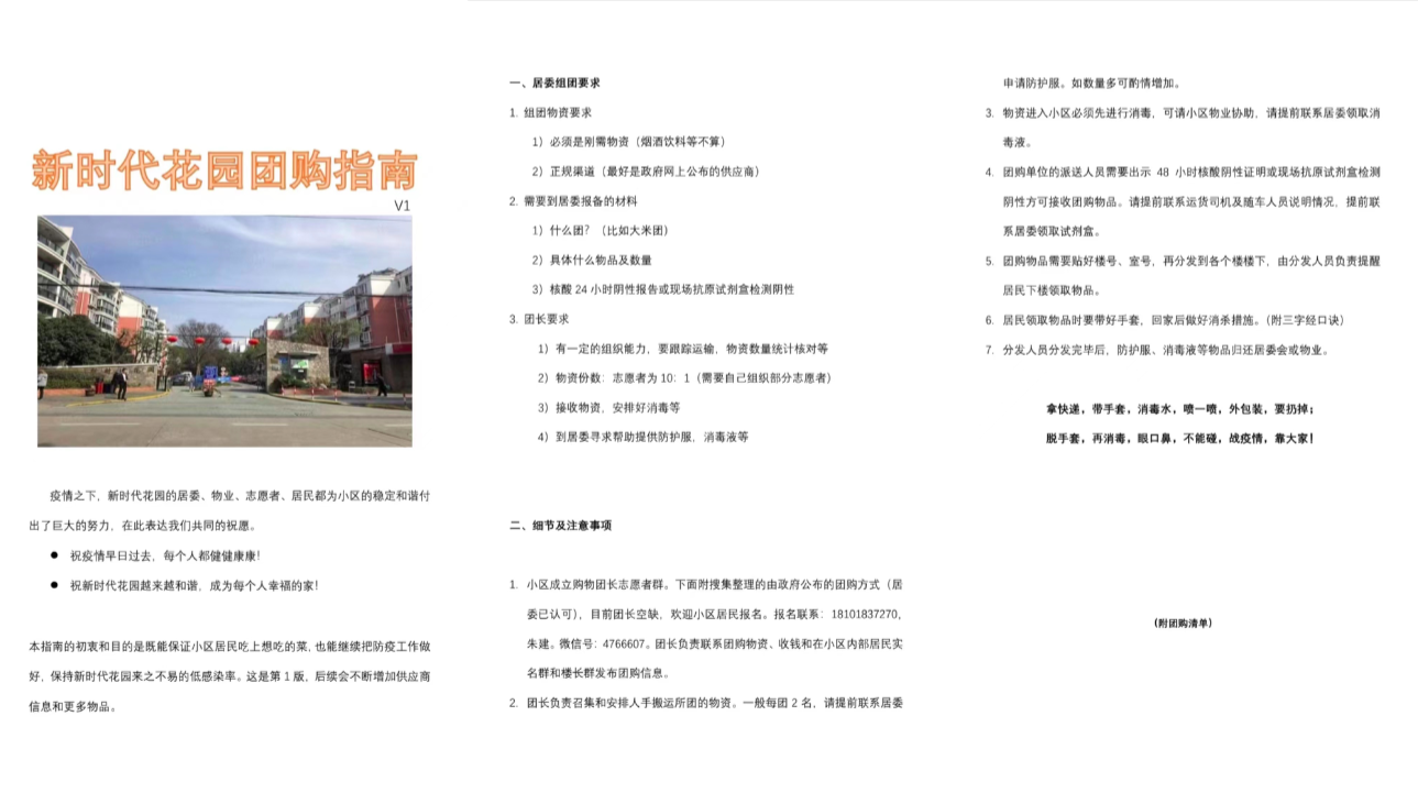 我们花半天时间搜集资料、筛选、确认来源,连夜编写了这份《新时代花园团购指南》,一共22页。内容涵盖居委组团要求、细节及注意事项、还有团购清单,包括菜源、价格、运送时效、开团人数、联系方式,是否有双证等。