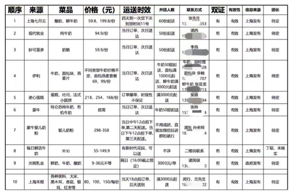 团购首先要保证菜源。“上海发布”、“上海消保委”等官方平台会发布团购信息,上海市商务委员会有疫情防控生活物资保障的企业证明,我逐一打电话询问企业情况,是否有开过团,怎么开团,其中很多电话打不通或是关机。