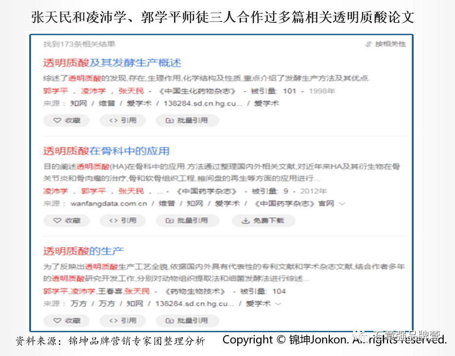 在网上,提到“中国玻尿酸之父”能搜出三个人,一个中国生化药学创始人之一的山东大学药学院教授、山东省药学科学院首席专家张天民,一个是鲁商集团总经理、山东省药学科学院研究员和山东大学国家糖工程技术研究中心主任凌沛学,一个华熙生物首席科学家、山东大学药学院研究生导师郭学平,两人均为张天民教授学生,张天民教授已经于2014年离去,凌沛学是师兄,郭学平是师弟,俩人年龄就差2岁。据网上搜索张天民和凌沛学、郭学平师徒三人合作过多篇关于透明质酸的论文。