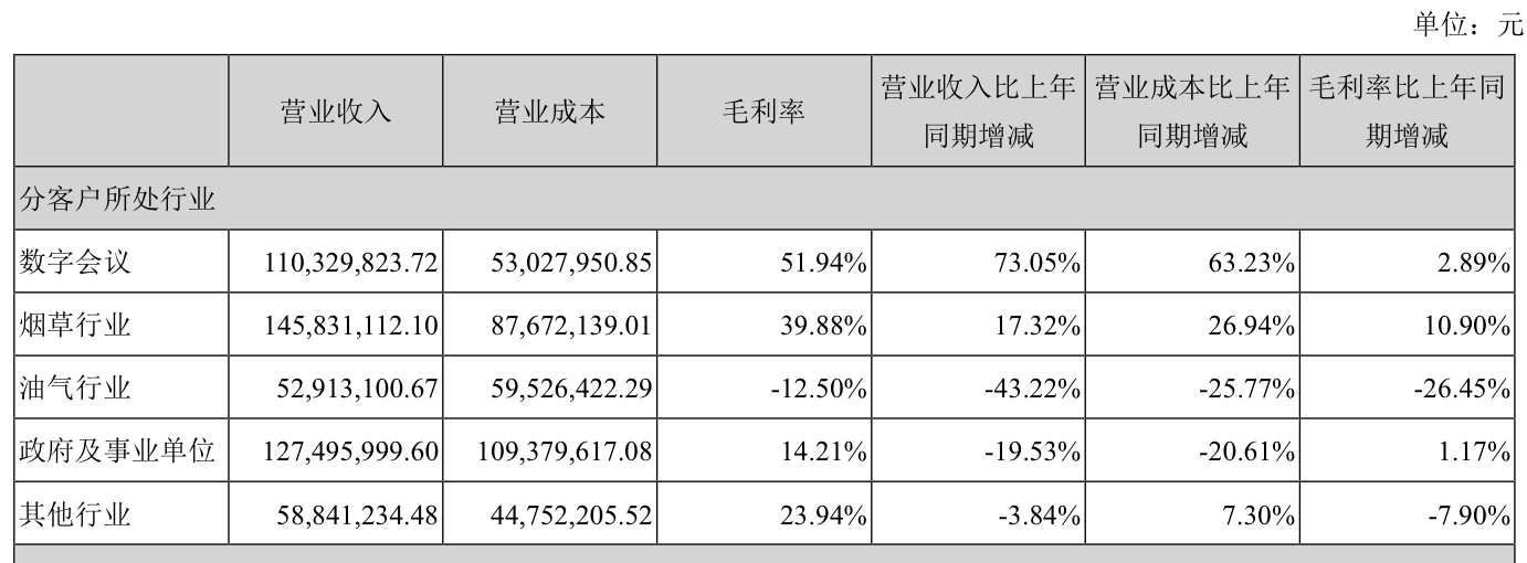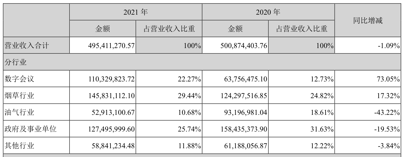 这许多业务板块中,数字会议领域2021年收入1.1亿元,同比增长率73.05%,增幅最大。而来自烟草领域的业务在2021年的毛利率增幅是最大的。