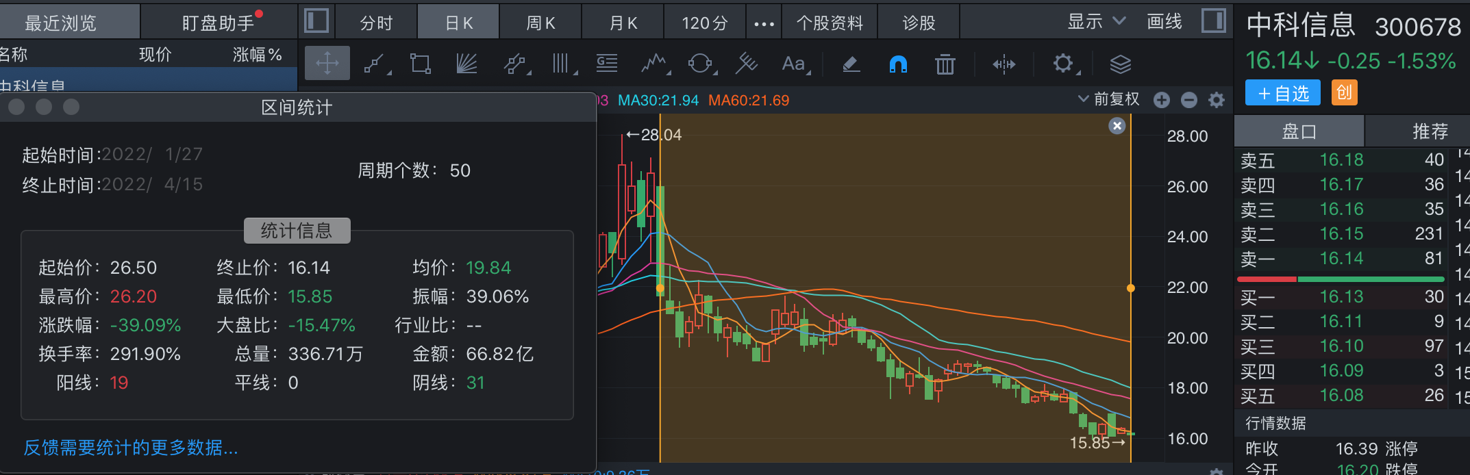 从盘面看,中科信息从1月27日至4月15日,已经累计下跌了39.09%,今年以来该股累计跌幅达33.94%,如今现价为16.14元。