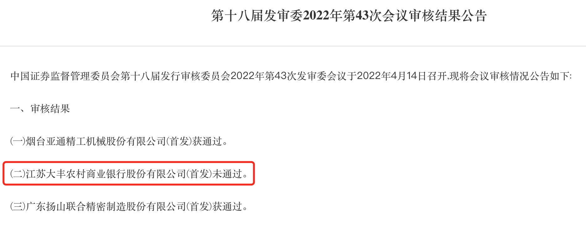 据证监会网站消息,证监会发行审核委员会2022年第43次发审委会议于2022年4月14日召开,江苏大丰农村商业银行股份有限公司(首发)未通过。 一同进门的另外两家公司则携手“晋级”。将大丰农商行拦下的发审委,究竟看出了公司什么“问题”?