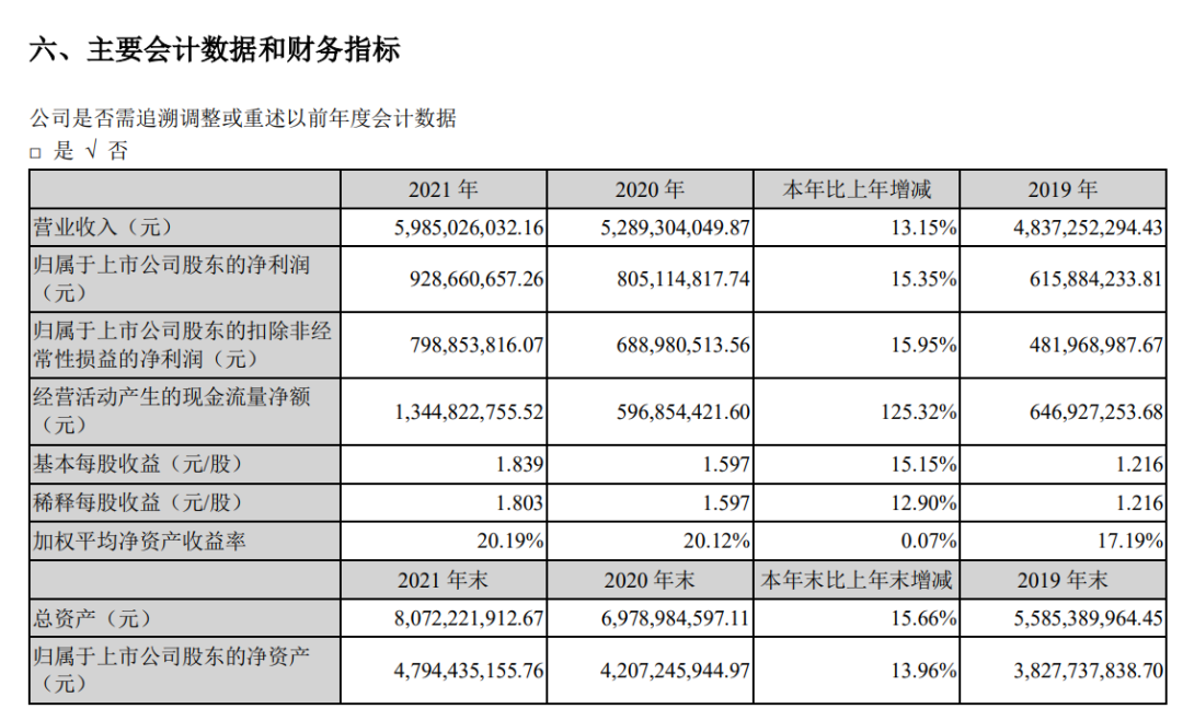 财报显示,2021年洽洽食品实现营业收入约59.85亿元,同比增加13.15%;归属于上市公司股东的净利润约9.29亿元,同比增加15.35%;基本每股收益1.839元,同比增加15.15%。