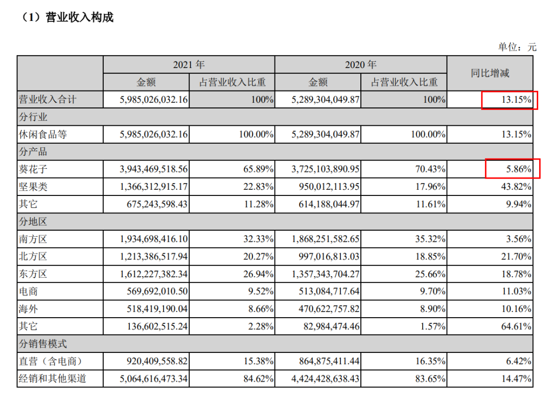 其中,按产品分类,葵花子实现收入39.43亿元,同比增长5.86%;坚果类实现收入13.66亿元,同比增长43.82%;其它实现收入6.75亿元,同比增长9.94%。