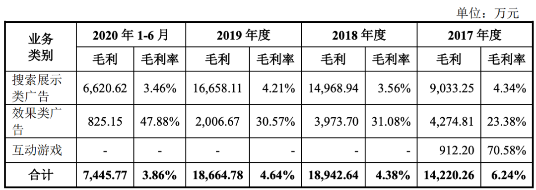 木瓜移动在招股书中称,由于搜索展示类广告主要面向脸书、谷歌等全球主流媒体进行用户引流,广泛覆盖用户,客户单次投放量较大,发行人(即“木瓜移动”)的投放效率高,单位产出大,毛利率较低的情况下也能为发行人带来可观的效益。