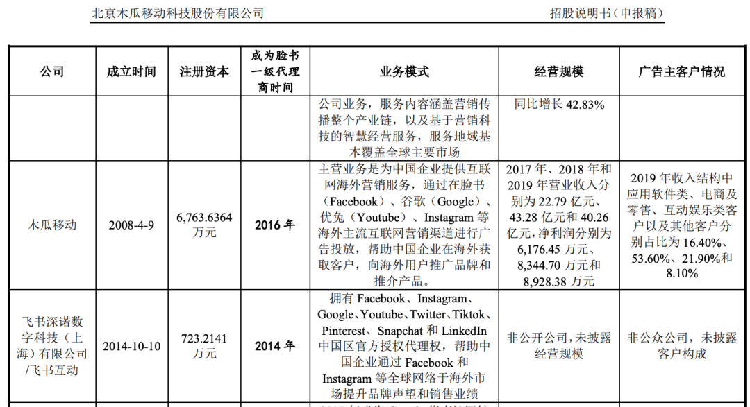 木瓜移动称,其拥有脸书一级代理资质和谷歌代理资质,通过为客户提供广告竞价、广告投放和广告优化服务。公司业务的盈利主要来自于互联网营销服务产生的营业收入与支付给互联网媒体的采购成本之间的差额。