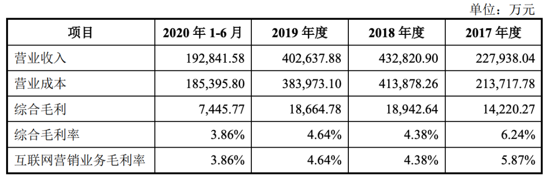 作为对比,同样从事互联网营销业务的行业可比上市公司(包括蓝色光标、佳云科技、腾信股份等)的平均毛利率分别为7.67%、3.44%、4.04%和3.84%,整体高于木瓜移动,尤其是佳云科技和腾信股份。