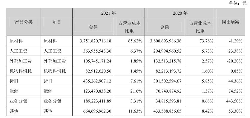 但这并不是杰瑞股份增收不增利的主要原因。相比原材料成本,人工工资、折旧、能源和业务分包费用均出现大幅上涨,其中业务分包费用达1.89亿元,同比大增443.50%,能源和折旧成本也分别同比增长74.52%和44.36%。相反,杰瑞股份在过去一年的原材料成本不增反降,2021年同比2020年的38.01亿元下降1.29%,占营业成本的比重也下降了近8个百分点。