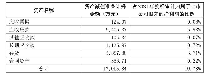 在年报发布的同时,杰瑞股份还发布了“关于公司2021年度计提资产减值准备的公告”,经过公司及下属子公司对可能发生减值的资产,包括存货、应收款项、固定资产、商誉等进行全面清查和资产减值测试后,2021年度拟计提各项减值损失约1.70亿元。其中,应收账款和存货减值分别计提9405.37万元和5887.88万元。相对应的,减少公司2021年度归属于上市公司股东净利润约1.45亿元。