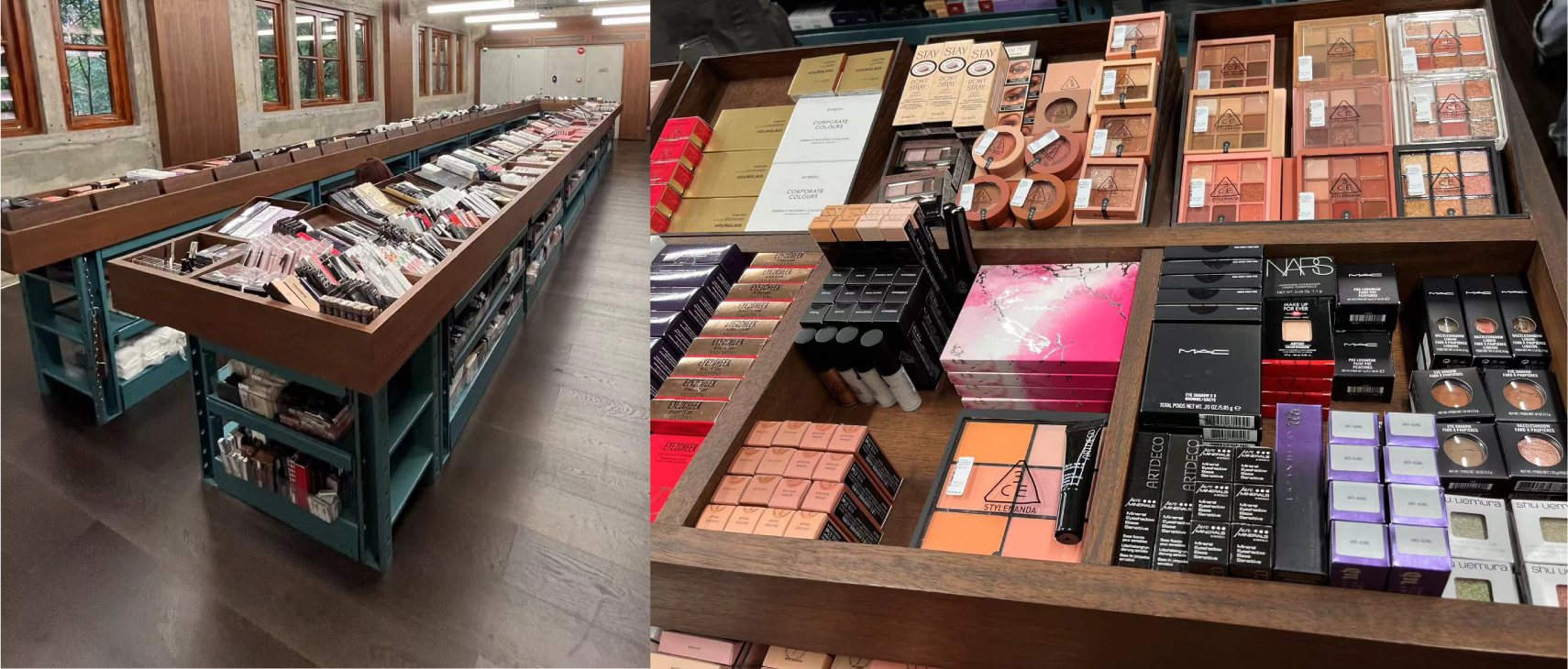三楼的彩妆区,入眼就是英国设计师彩妆品牌Charlotte Tilbury货台,从口红到眼影、腮红、蜜粉饼,Charlotte Tilbury全线产品几乎都囊括其中,而继续深入,迪奥、香奈儿、玫珂菲、NARS、3CE、URBAN DECAY等品牌也可自助选择。