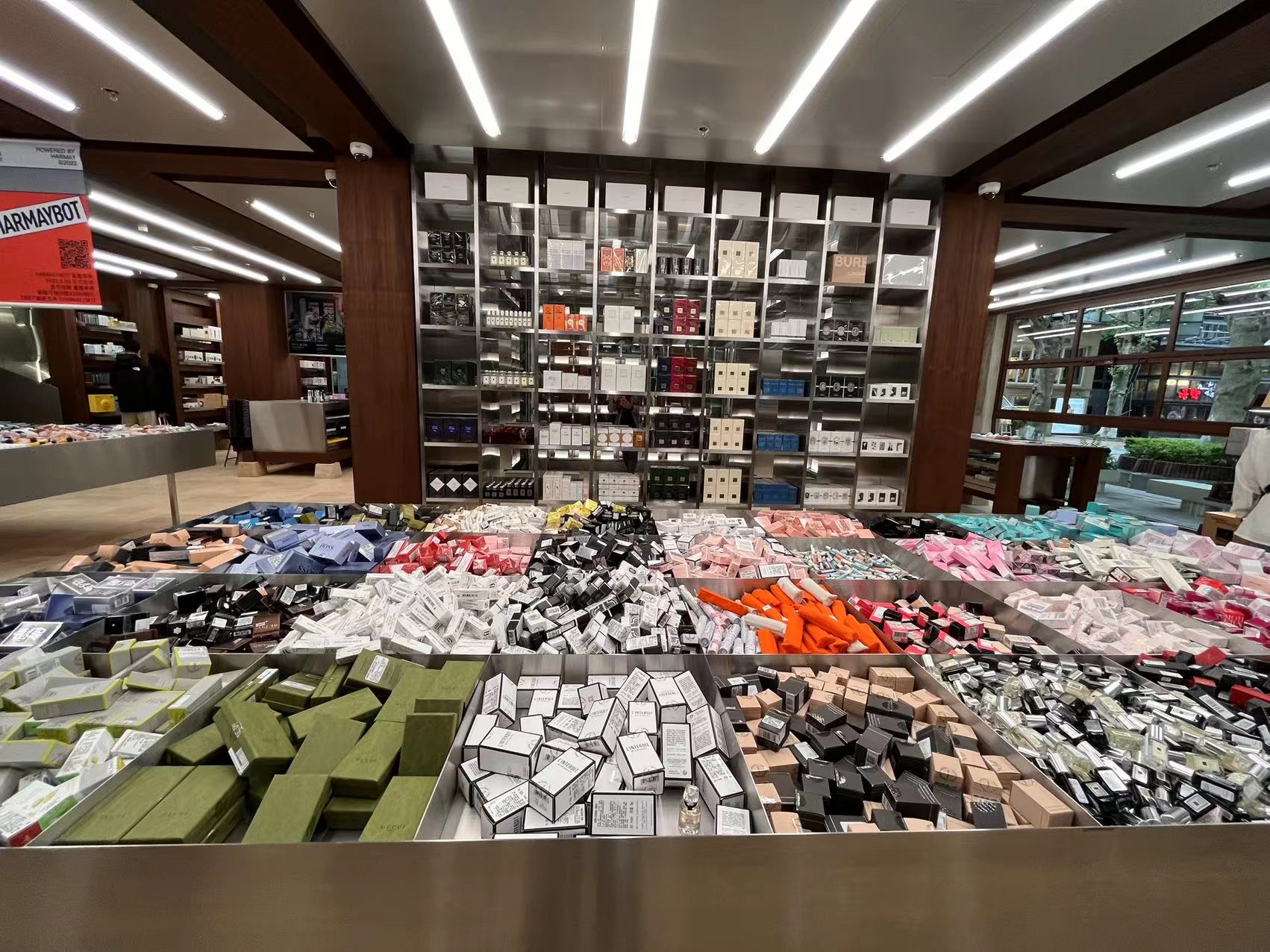 二楼的护肤品区域,货架上层摆放正装、礼盒,下层就是各类小样,从芙丽芳丝、倩碧到雅诗兰黛、La Mer、赫莲娜都能找到;男士护肤品如朗仕、碧欧泉也有专门的货架。尽管此前曾被罚,但小样依旧是HARMAY 話梅特色,GUCCI、爱马仕等高奢品牌香水小样也在明显的陈列区,是消费者们研究比照的热门。