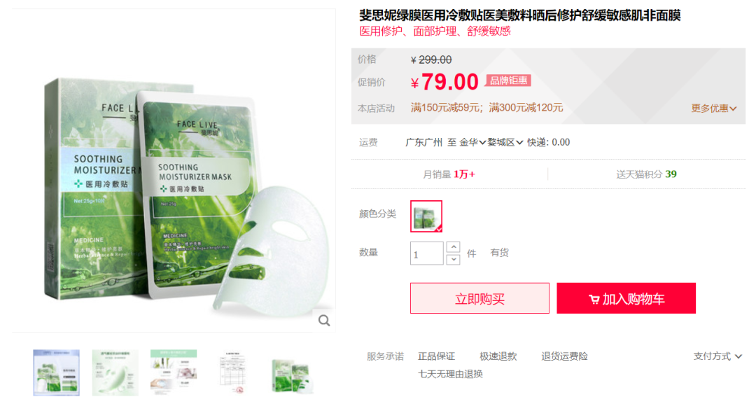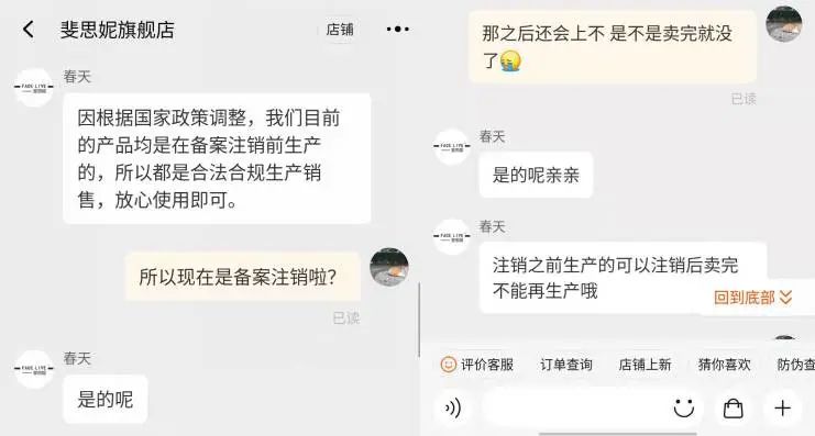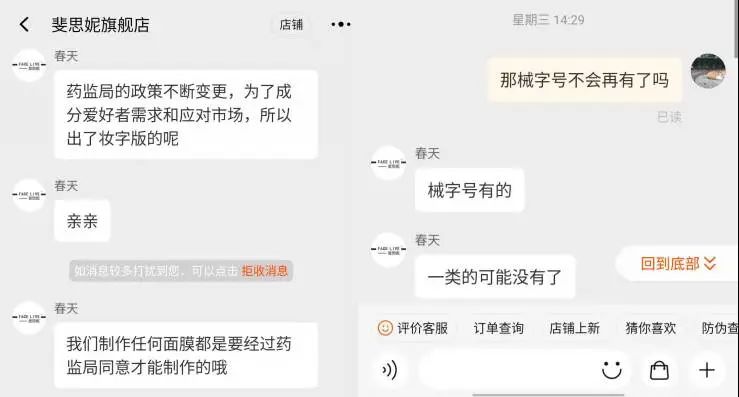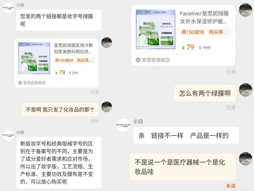 比如,在记者与斐思妮品牌的淘宝店铺客服沟通的过程中,对方提到,因为药监局政策不断变更,所以品牌推出了“妆字版”斐思妮绿膜,械字号产品还是会有,但第一类(医用冷敷贴)可能不会再有了。