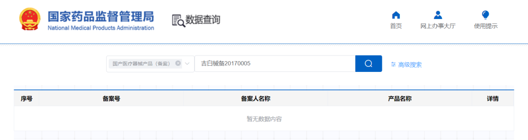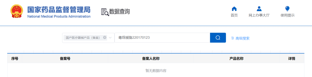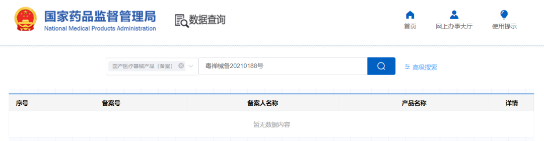 部分在市场端有一定知名度的产品,如菲尔思医用光子冷敷贴(吉白械备20170005号)、雅奇医用冷敷贴(粤珠械备20170123号)、斐思妮绿膜(粤禅械备20210188号)的搜索结果都为“暂无数据内容”。