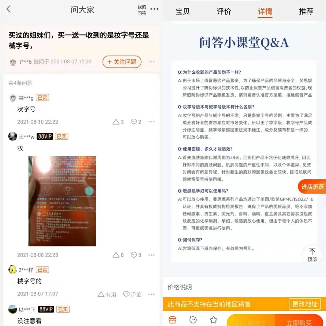当前,在斐思妮天猫官方店铺“虾青素传明酸修复贴”购买链接下,据消费者回答可见,2021年8月左右,消费者在同一个产品链接中下单,可能收到妆字号、械字号两种不同的产品。