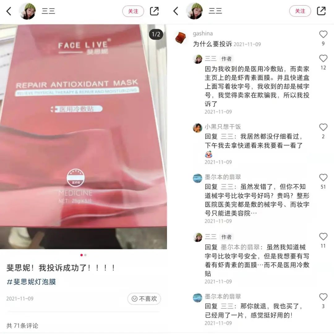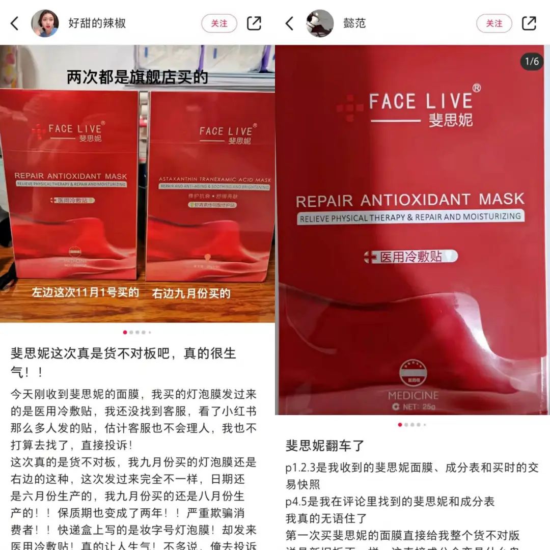 多位小红书网友发帖表示,自己购买的是虾青素传明酸修复贴,收到的却是医用冷敷贴,产品货不对板。这在一定程度上证明了斐思妮曾存在“同一链接,妆械混卖”的情况。
