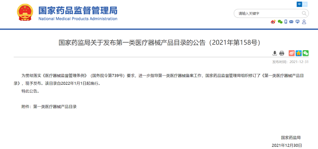 同日,关于实施《第一类医疗器械产品目录》(下称“新《一类目录》”)有关事项的通告发布,其中提到:自2022年1月1日起,第一类医疗器械均应当按照新《一类目录》实施备案。